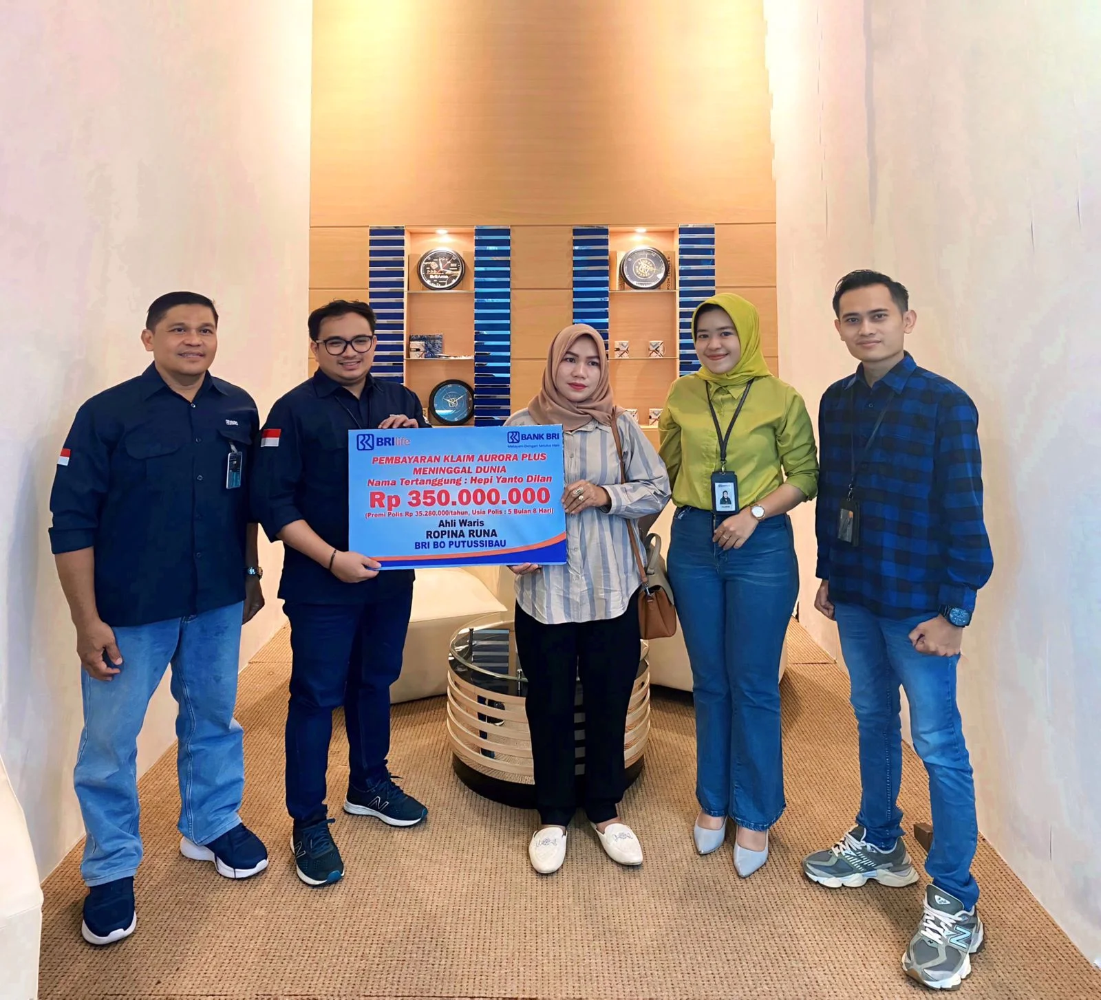 Penyerahan klaim meninggal dunia produk Aurora Plus di Branch Office (BO) atau Kantor Cabang BRI Putussibau Kabupaten Kapuas Hulu kepada tertanggung atas nama Hepi Yanto Dilan, Usia Polis 5 Bulan 8 Hari, Premi 35.280.000/tahun dengan UP 350.000.000.
